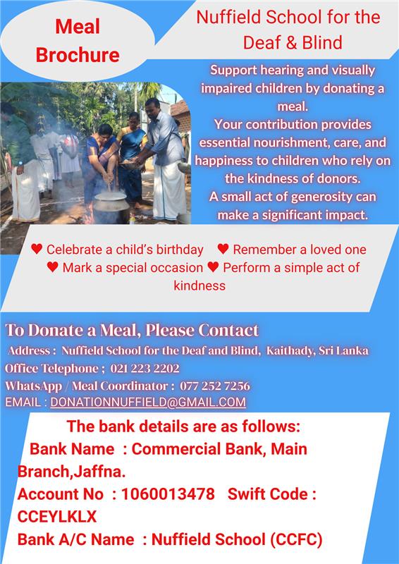 For any other special meals, please contact the Meal Coordinator on mealdonations@sltnet.lk or 0112623601 or 0704752900 (whatsApp)